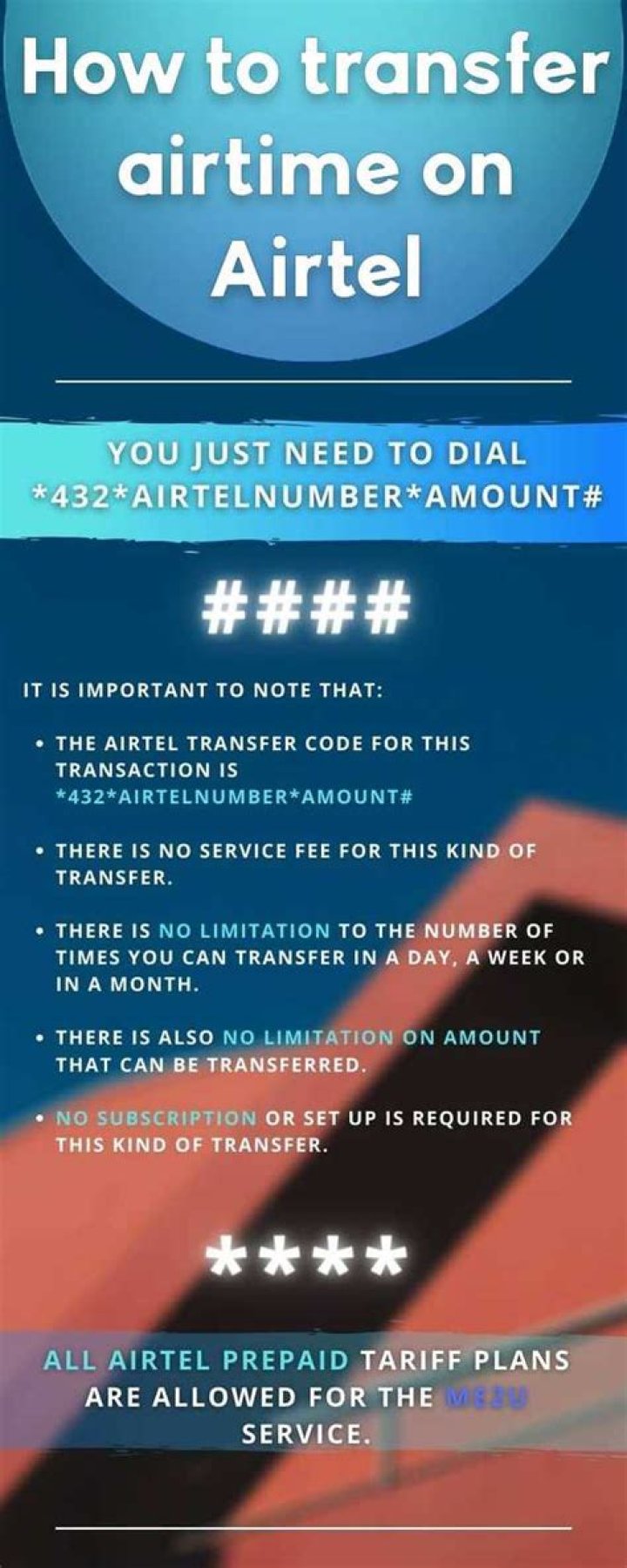 • Reliable: Airtel is a reliable provider of airtime transfer services. You can be sure that your transactions will be processed quickly and securely.